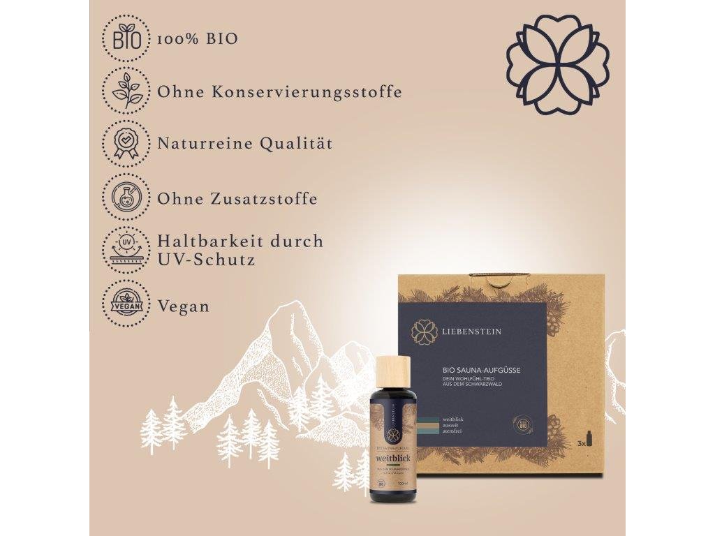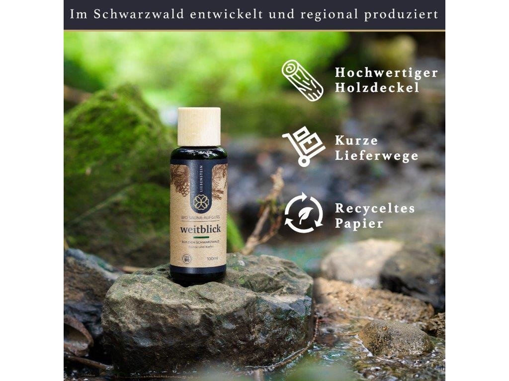 REGIONÁLNÍ VÝROBA – Vůně do sauny jsou vyvinuty německou společností Liebenstein ve Schwarzwaldu ve spolkové zemi Bádensko-Württembersko, obsahují tu nejlepší pramenitou vodu Černého lesa a jsou vyráběny a baleny ve spolupráci s regionálními partnery. Společnost si zakládá na krátkých vzdálenostech a tradičním, šetrném výrobním procesu pro ideálně vyrobený produkt