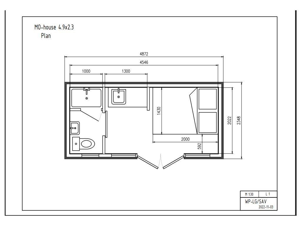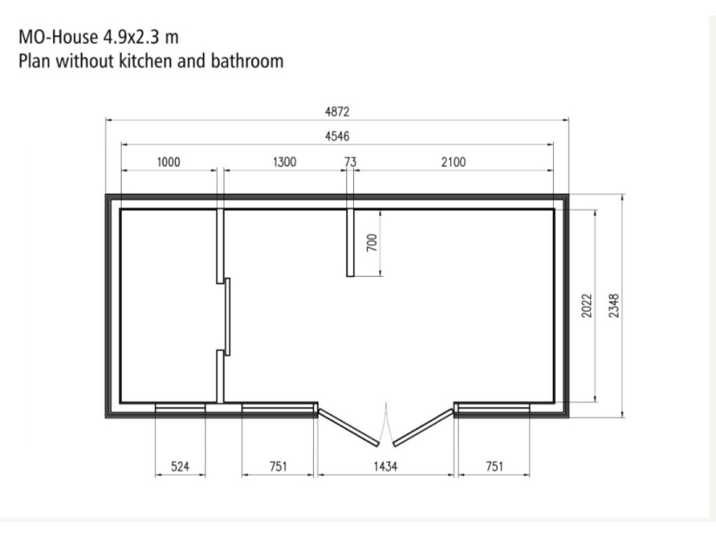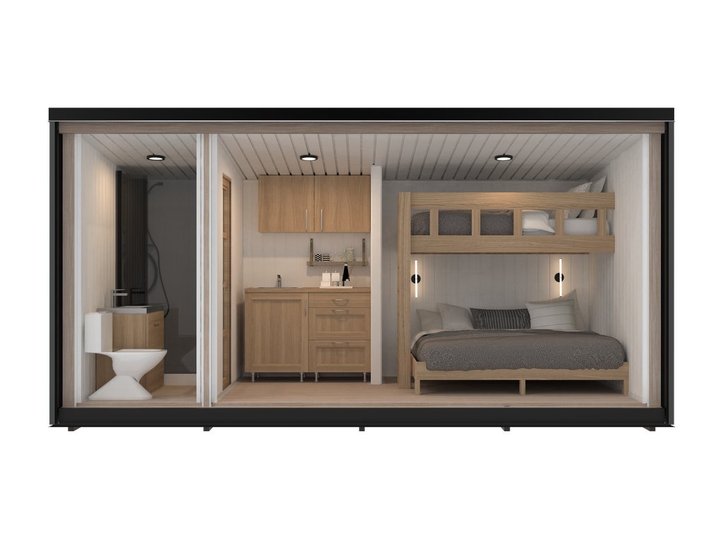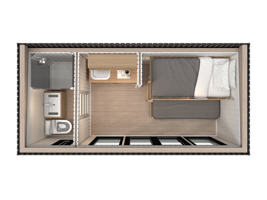 Standardní modul o velikosti 4,9 × 2,3 m (9,19 m²) je vhodný pro jednotlivce nebo páry, ale skvěle poslouží i jako kancelář, ateliér, prostor pro rekreaci nebo ubytování hostů.