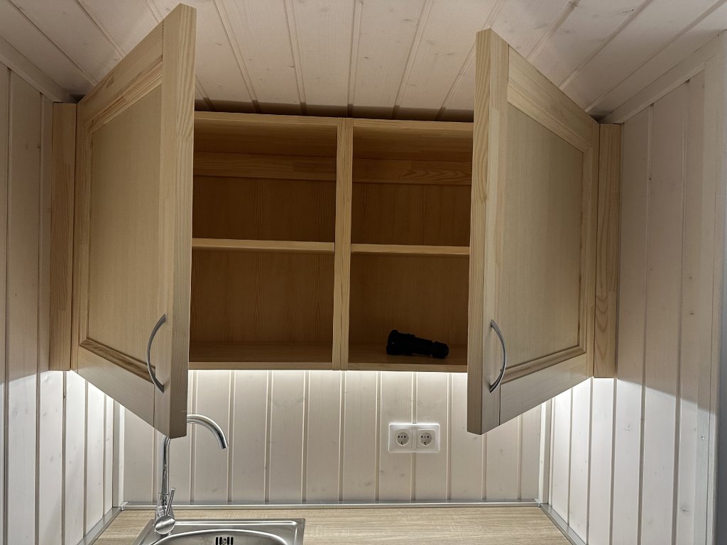 | Okna: | 2× 735 × 1955 mm (u dveří) – dřevěná, lakovaná, 1x 410х1150 мм |