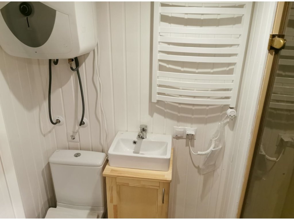 | Okna: | 2× 735 × 1955 mm (u dveří) – dřevěná, lakovaná, 1x 410х1150 мм |
