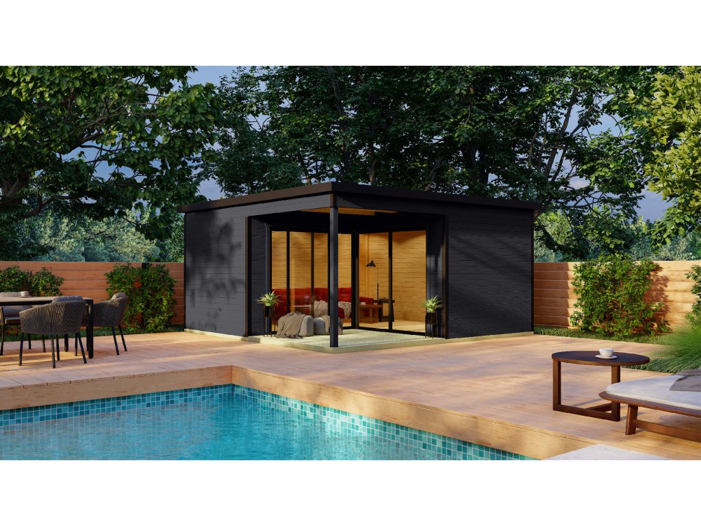 Dřevěný zahradní domek Domeo 6 s teráskou, s hliníkovými rámy, 500 x 500 cm, 44 mm