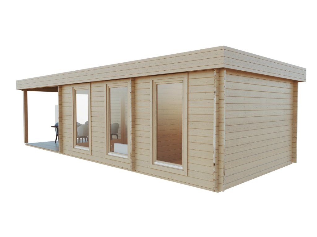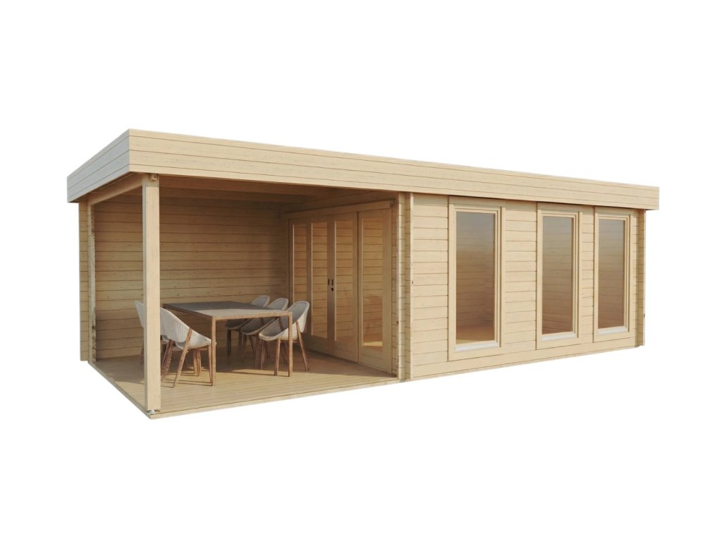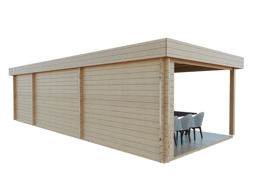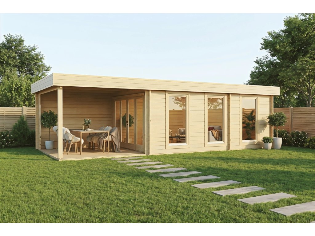 Obývací pokoj ve vaší zahradě - to je tento ultramoderní prostorný roubený zahradní domek se zastřešenou terasou. Pro všechny, kdo si chtějí užít opravdové pohody.