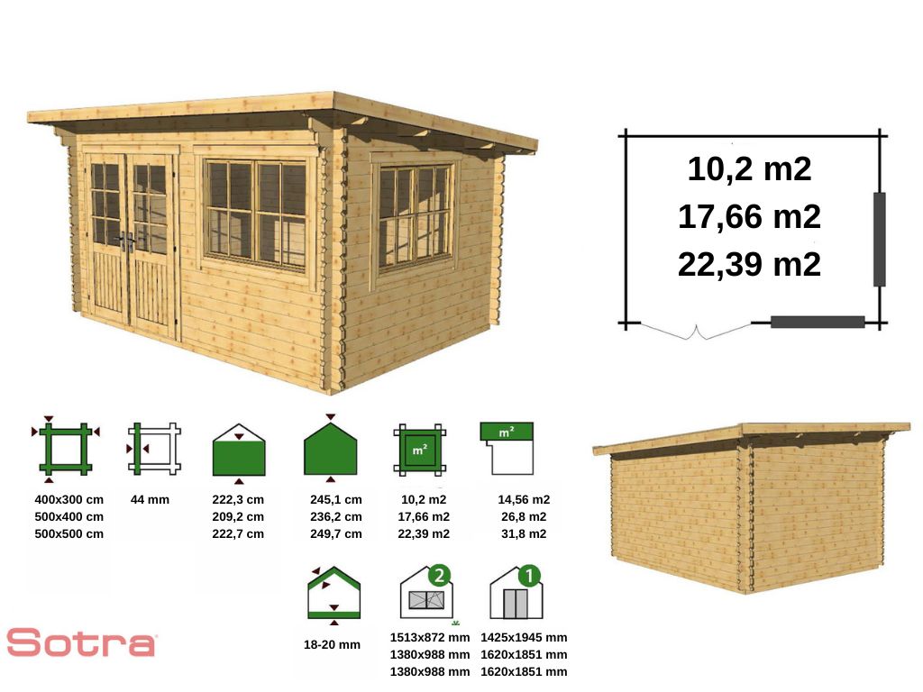 Dřevěný zahradní domek LILLIAN 44 TP 500 x 400 / 400 x 300 / 500 x 500 cm, 44 mm