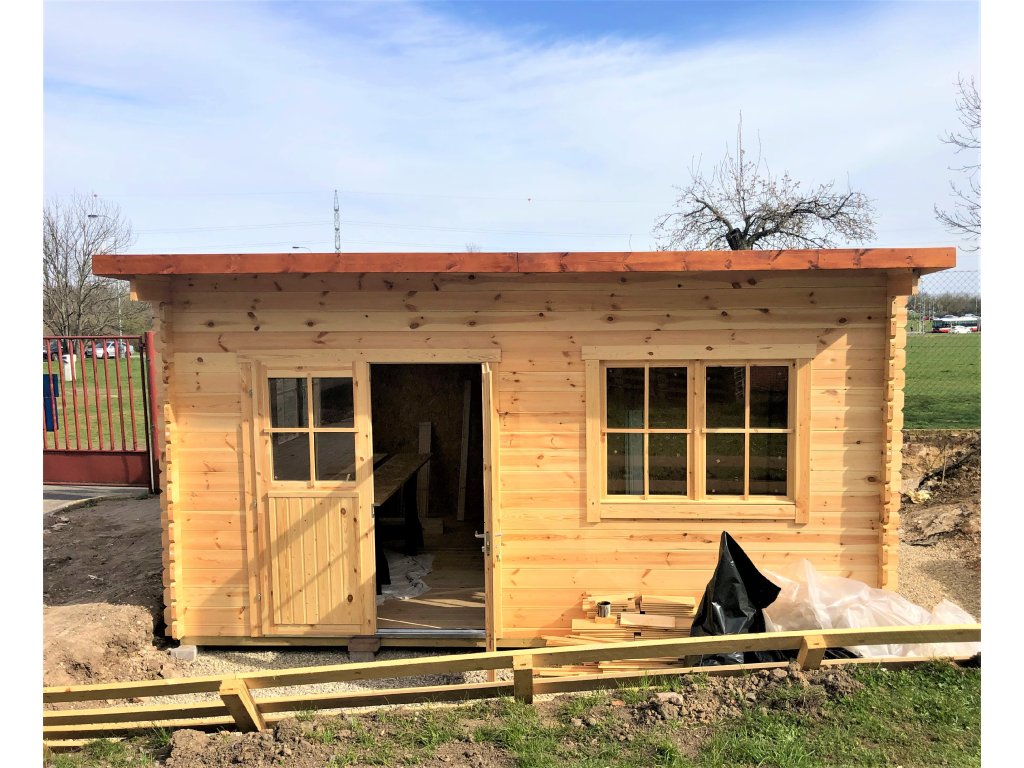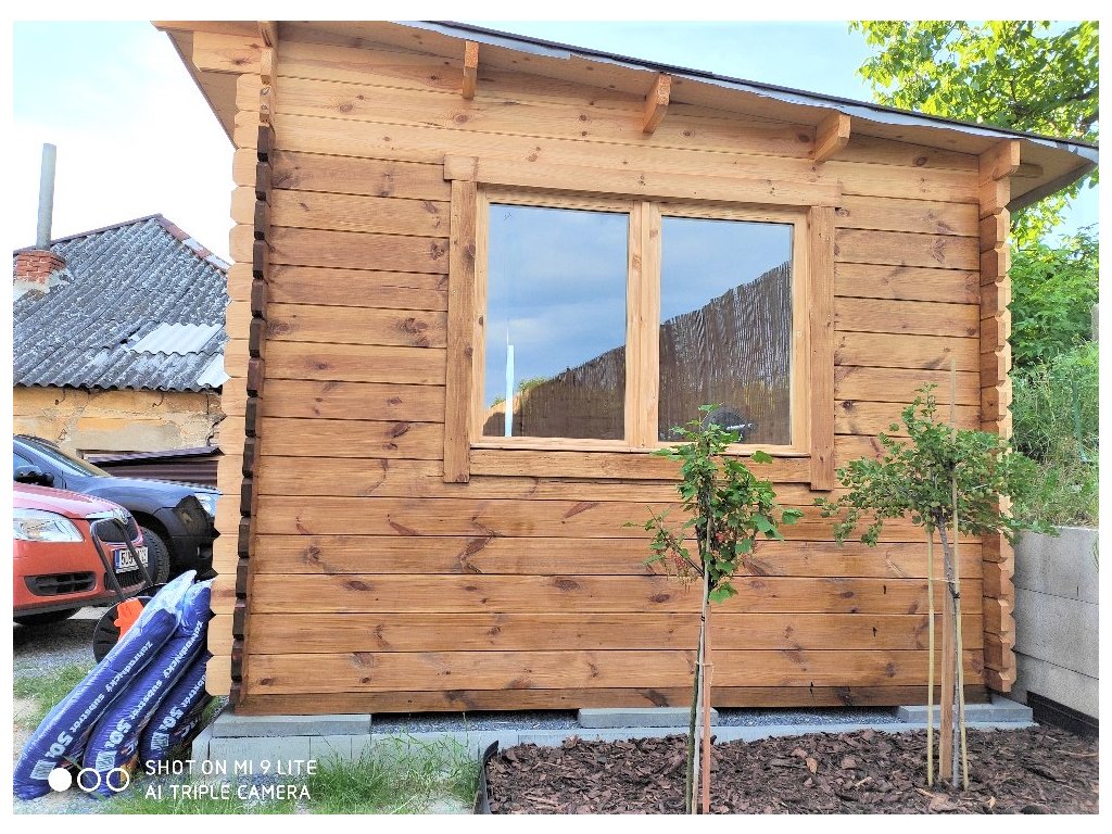 Zahradní domek má přírodní barvu bez jakékoliv povrchové úpravy a je připraven k dalším nátěrům a impregnacím.
