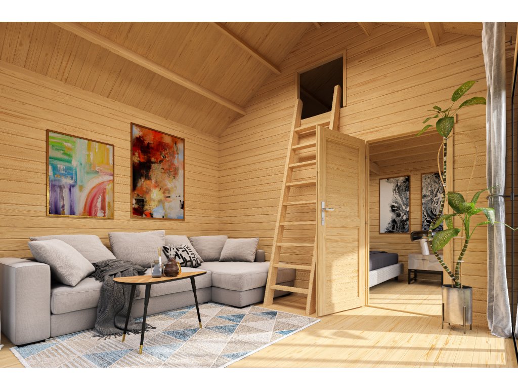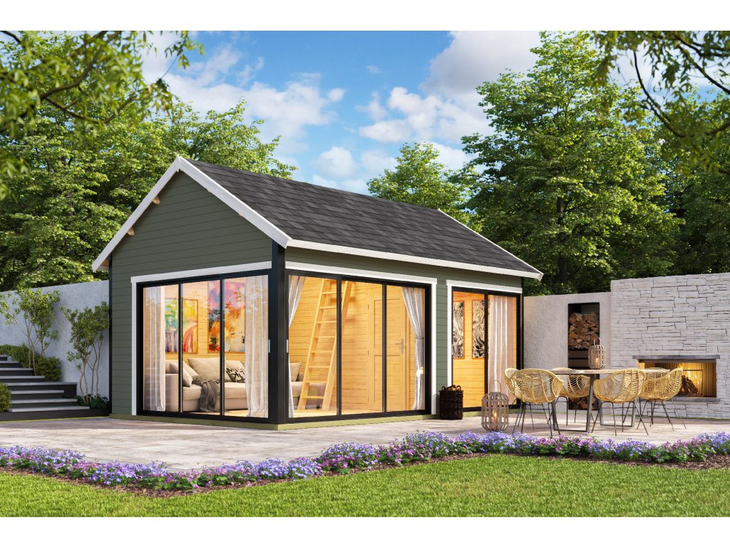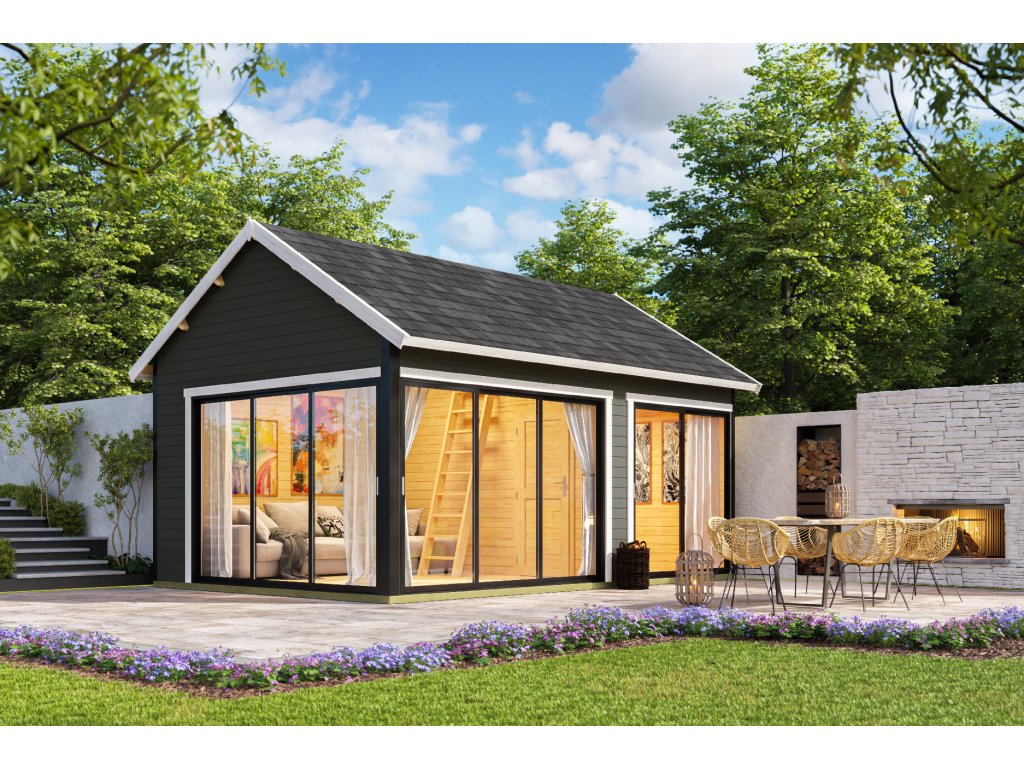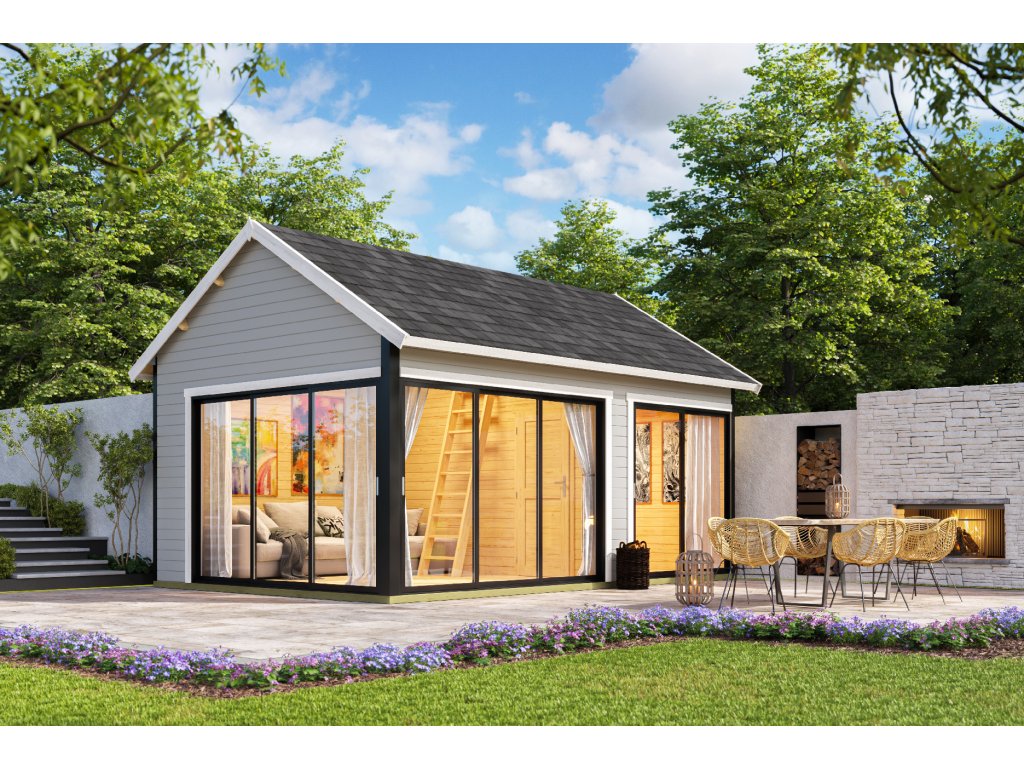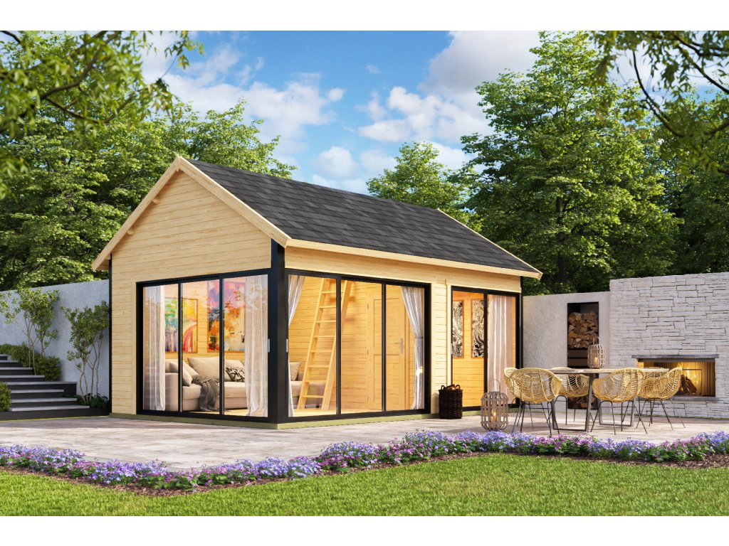 Dřevěný zahradní domek Murano 3, s hliníkovými rámy, 575 x 390 cm, 44 mm, patro na spaní