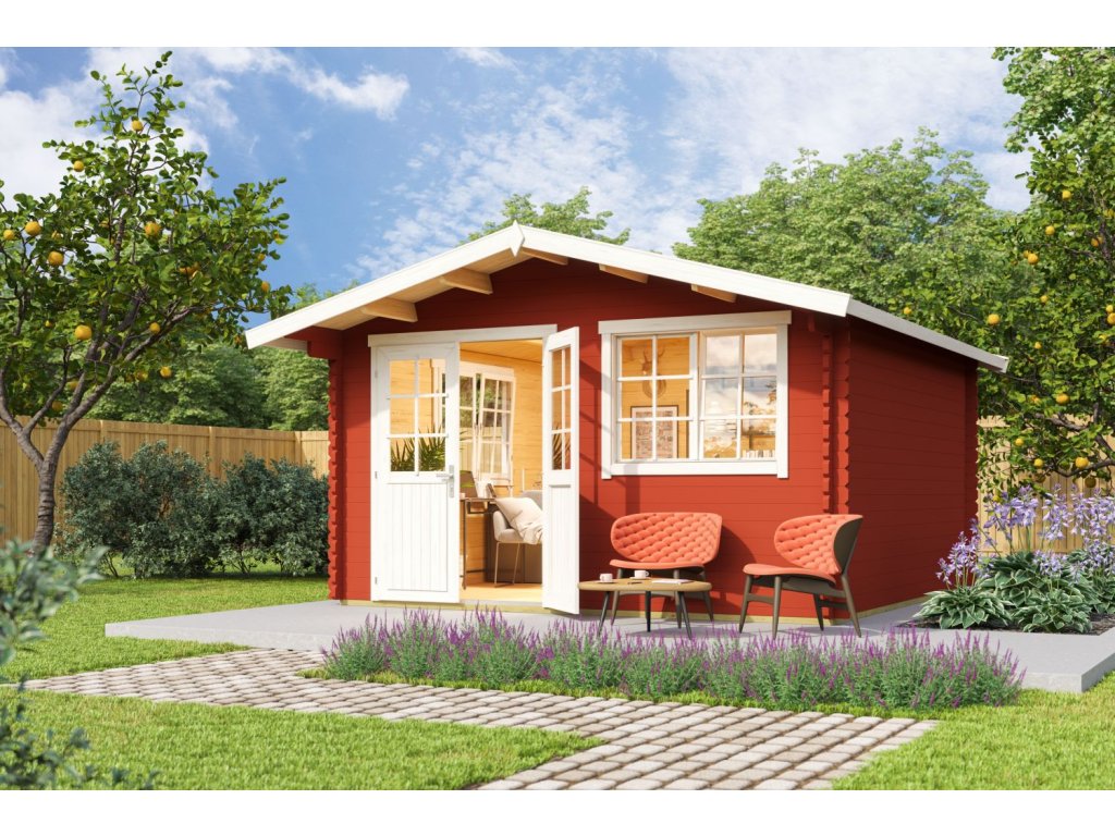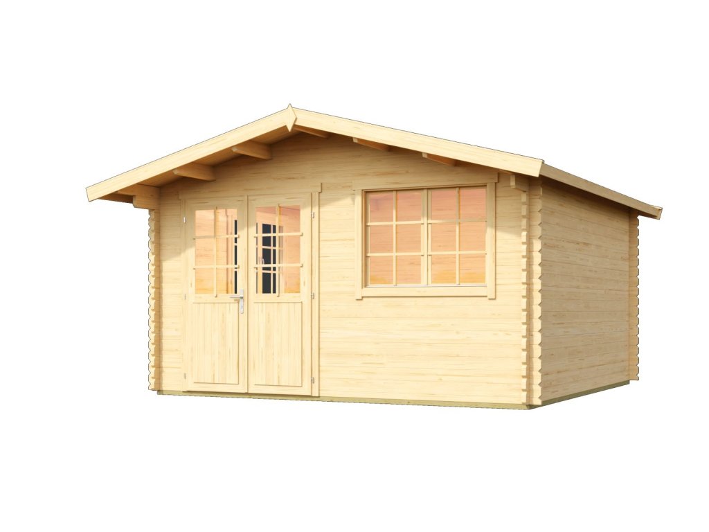Roubený zahradní domek Norderney 3 představuje nadčasovou eleganci. Má dvě dvoukřídlá okna a široké dvoukřídlé dveře. V nabídce též ve variantě 390 x 300 cm.