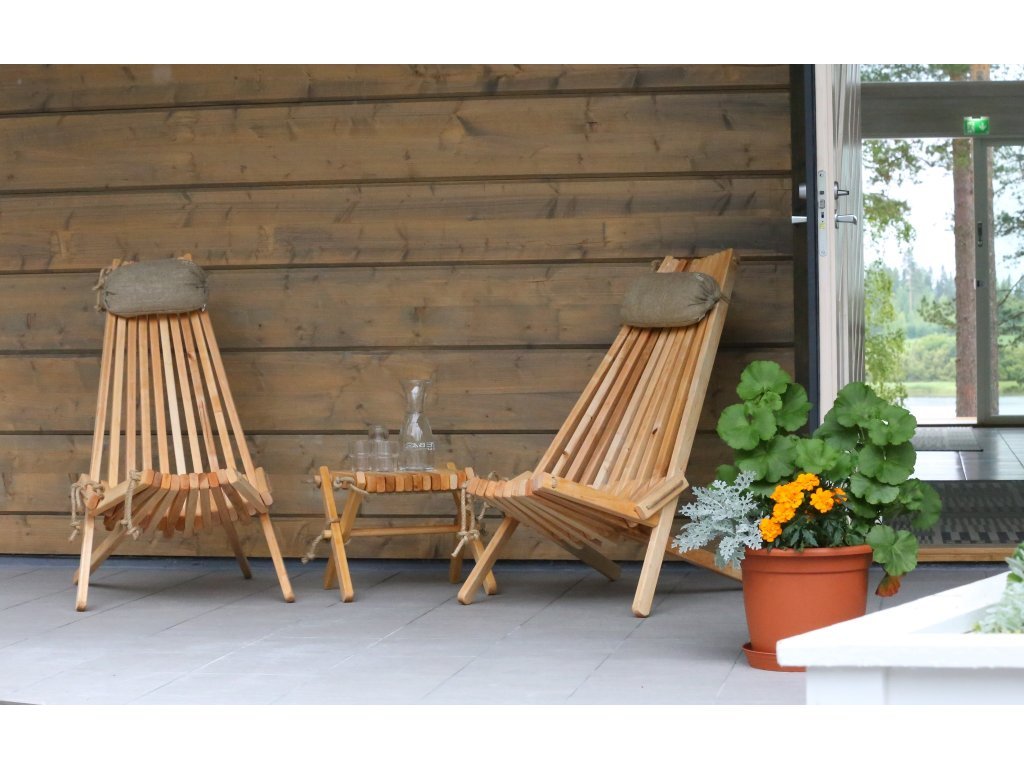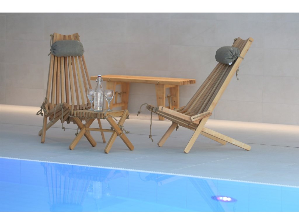Designový venkovní a zahradní nábytek ECO Lilli můžete použít jako skládací podnožku, stolek nebo jako opěrku nohou pro maximální odpočinek. Vyrobeno pouze ze dřeva a lana. Je stejně přirozená jako samotná příroda, ideální pro vnitřní i venkovní použití, do sauny, lázní, na terasy i zahradu. Produkty jsou jednoduché a přesto vizuálně přitažlivé a poskytují prostor pro relaxaci. Montáž pomocí pružného konopného lana dodává výrobku flexibilitu směrem k uživateli a díky své konstrukci se hravě přizpůsobí každému povrchu.