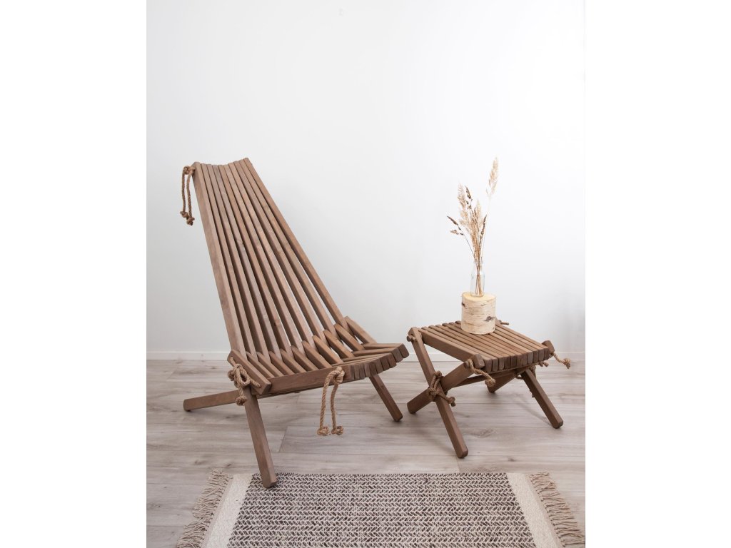 Designový venkovní a zahradní nábytek ECO Lilli můžete použít jako skládací podnožku, stolek nebo jako opěrku nohou pro maximální odpočinek. Vyrobeno pouze ze dřeva a lana. Je stejně přirozená jako samotná příroda, ideální pro vnitřní i venkovní použití, do sauny, lázní, na terasy i zahradu. Produkty jsou jednoduché a přesto vizuálně přitažlivé a poskytují prostor pro relaxaci. Montáž pomocí pružného konopného lana dodává výrobku flexibilitu směrem k uživateli a díky své konstrukci se hravě přizpůsobí každému povrchu.