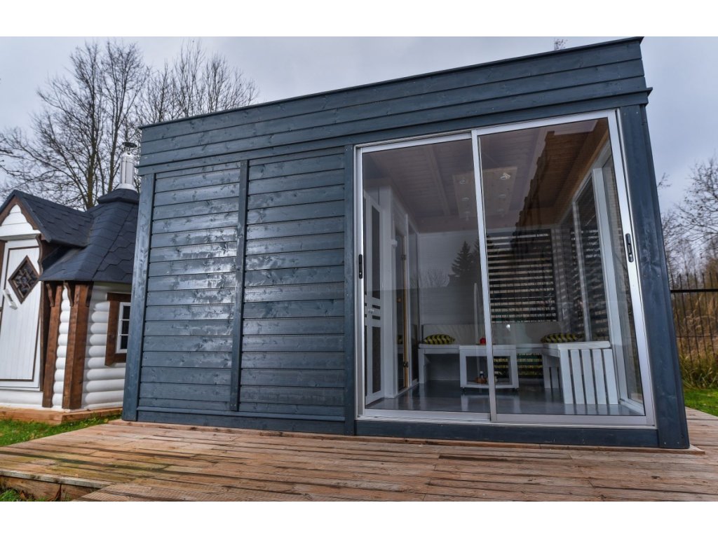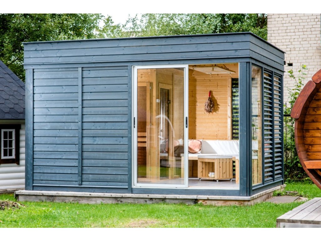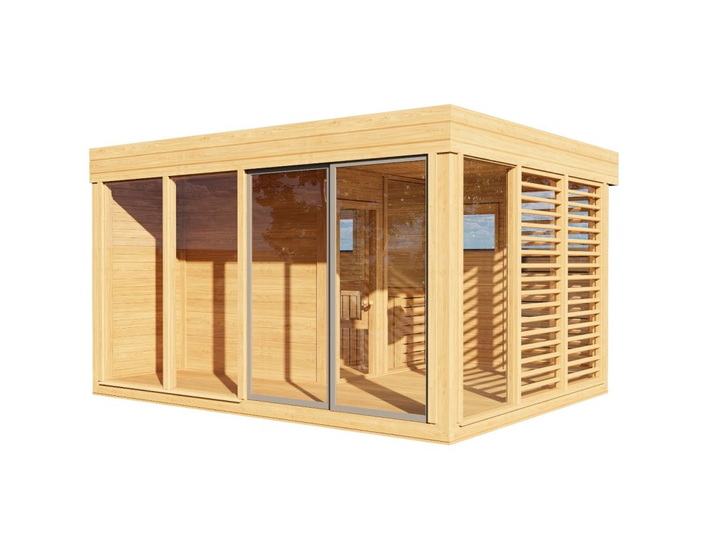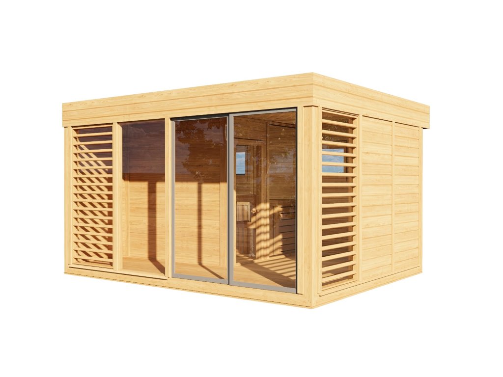 Kompletně izolovaná velmi pěkná venkovní sauna SCANDI MAGNUM se třemi místnostmi a prosklenou přední stěnou vyrobená ze smrku. Saunový domek SCANDI o rozměrech 2 x 3 metry poskytuje saunové potěšení na nejvyšší úrovni v moderním designu. Zvláštností modelů z této série je možnost výměny stěnových nebo skleněných prvků, aby bylo možné dosáhnout vzhledu přesně odpovídajícího vašim přáním.