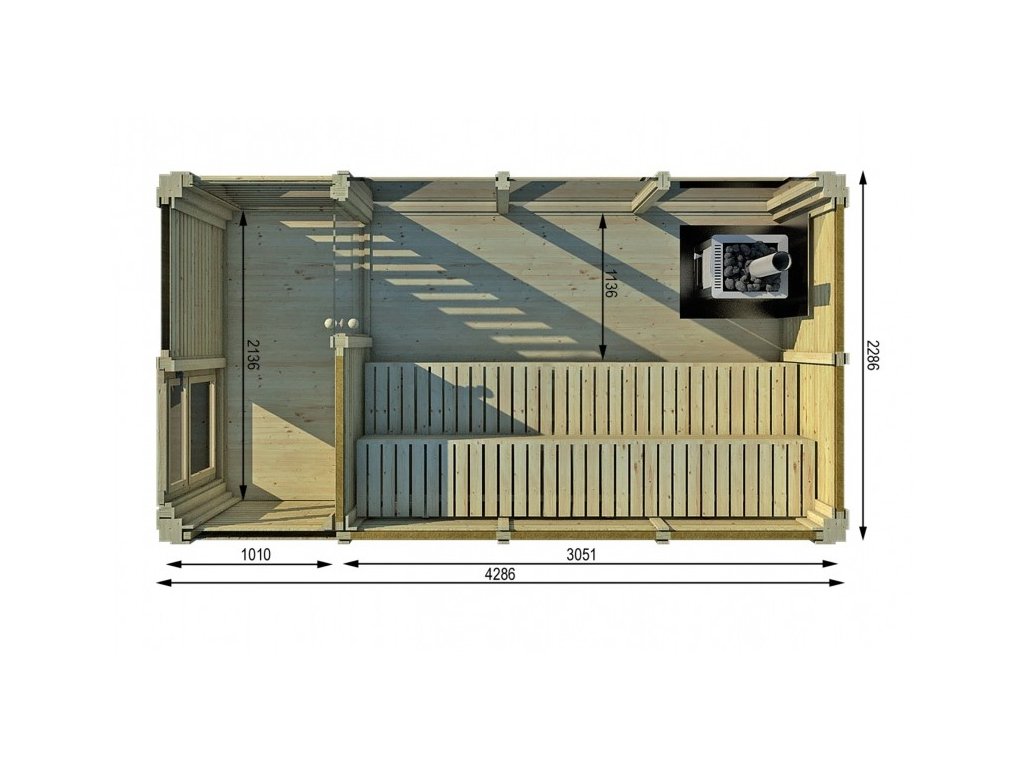 - saunová kamna elektrická nebo kamna na dřevo (možnost výběru ⇒ zde)