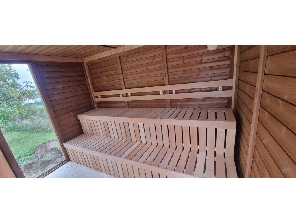 - Dvouúrovňové lavice jsou vyrobeny z bezsukové osiky: horní 301 x 60 cm, dolní 301 x 50 cm
