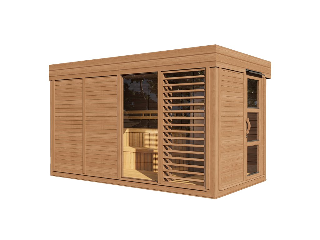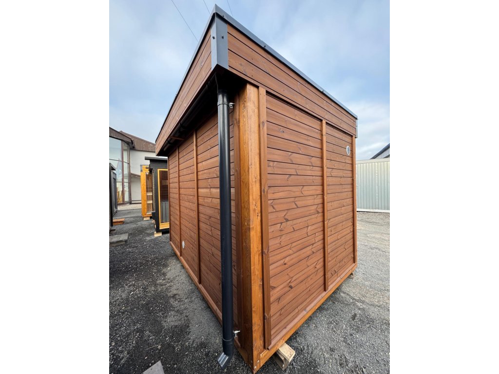 Kompletně izolovaná velmi pěkná venkovní sauna SCANDI EXTRA se dvěma místnostmi a prosklenou přední stěnou vyrobená z ThermoWoodu. Saunový domek SCANDI o rozměrech 2 x 3 metry poskytuje saunové potěšení na nejvyšší úrovni v moderním designu. Zvláštností modelů z této série je možnost výměny stěnových nebo skleněných prvků, aby bylo možné dosáhnout vzhledu přesně odpovídajícího vašim přáním.