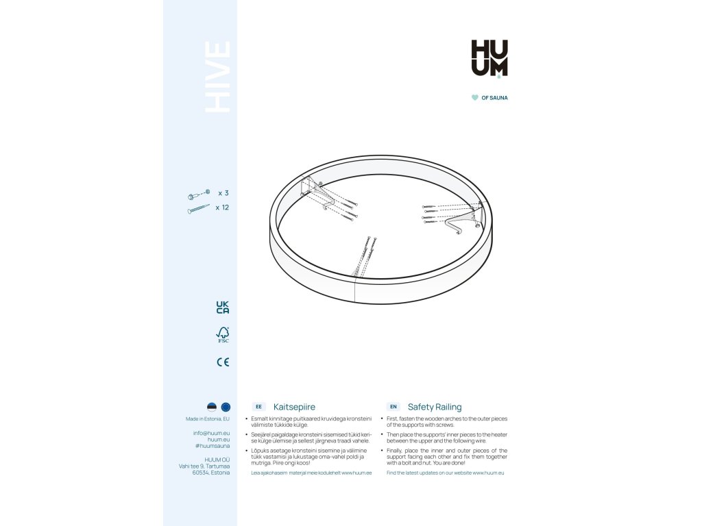Bezpečnostní ohrádka pro ohřívače Huum Hive pomáhá chránit uživatele před náhodným dotykem o horký ohřívač.Bezpečnostní zábradlí se skládá ze světlých dřevěných oblouků a podpěr z nerezové oceli pro upevnění k ohřívači.