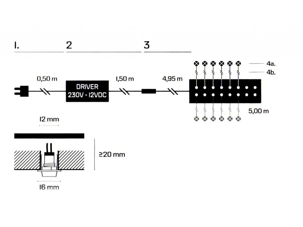 Každá LED lampa má vlastní, 5 metrů dlouhý kabel s konektory. To umožňuje univerzální řešení osvětlení. V případě potřeby lze LED lampu připojit k 10metrovému kabelu (2 kusy 5m propojovacích kabelů). Díky tomu je možné osvětlit i vysoké místnosti.