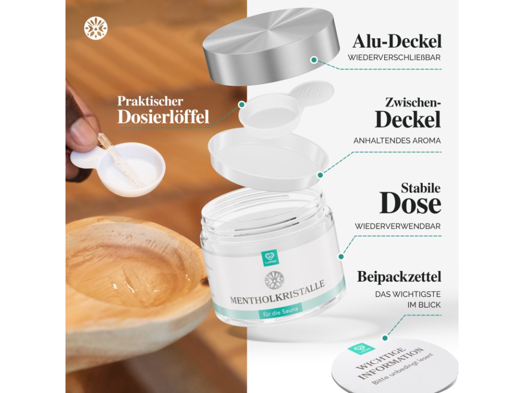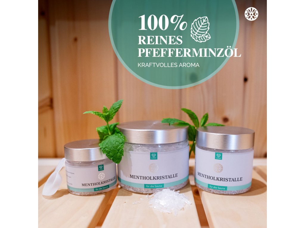 Proměňte obyčejné saunování v jedinečný zážitek! Ledová máta poskytuje v horku sauny nejen ochlazující změnu, ale také Vám umožní znovu zhluboka dýchat. Naše mentolové krystaly vyrobené z čistých lístků máty peprné jsou baleny v praktické, uzavíratelné dóze včetně užitečné odměrky a mezivíčka. Lžičkou krystaly lehce nadávkujete, aniž byste se jich dotýkali prsty.
