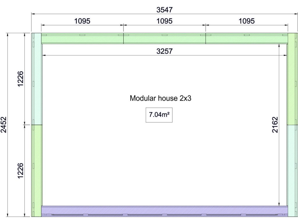 | Plné panely (5×): | Rozměr panelu: 1000 × 2650 mm Rám stěny: 45 × 95 mm Izolace: 100 mm (kamenná/minerální vata); panel je opláštěn zevnitř palubkami 14 × 96 mm a zvenku fasádními prkny z borovice 18 × 145 mm Tloušťka hotového stěnového segmentu: 145 mm |