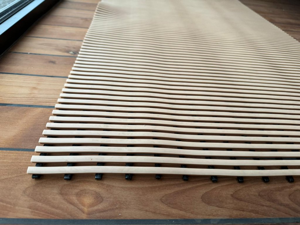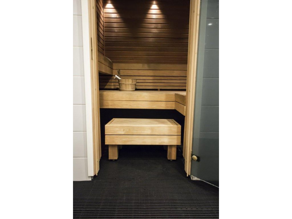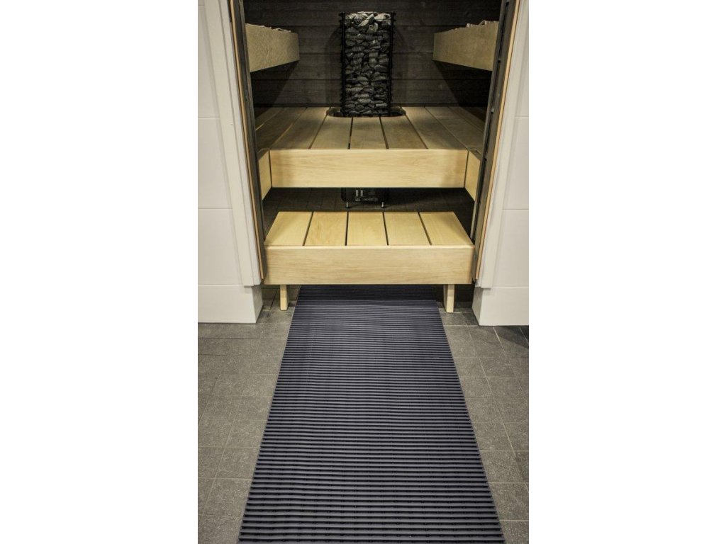 Na podlaze sauny je horní limit teploty s rezervou splněn - je tedy ideální ochranou saunové podlahy proti uklouznutí a díky svým tepelně-izolačním vlastnostem a flexibilitě také příjemnější variantou nášlapu.