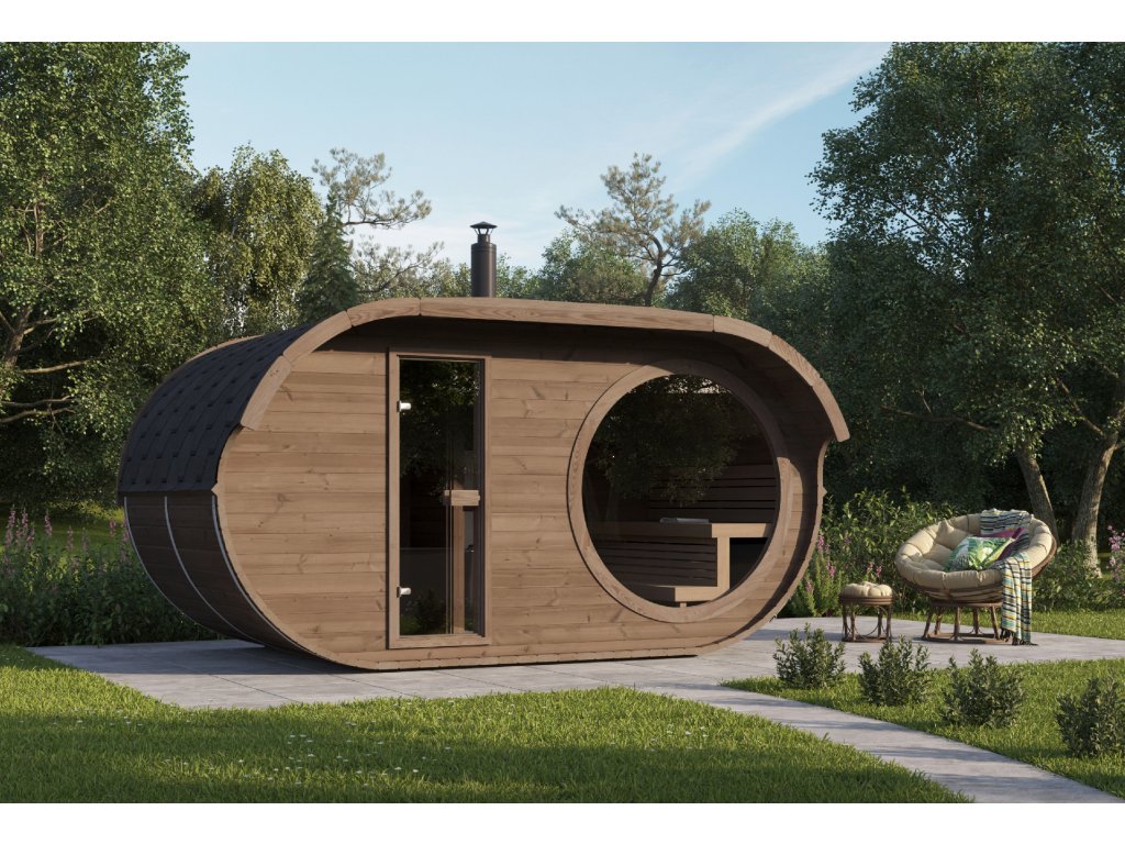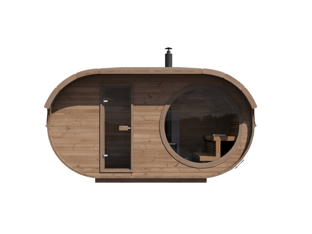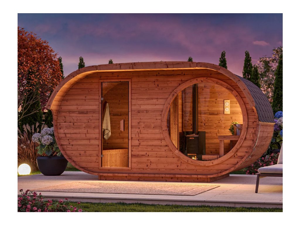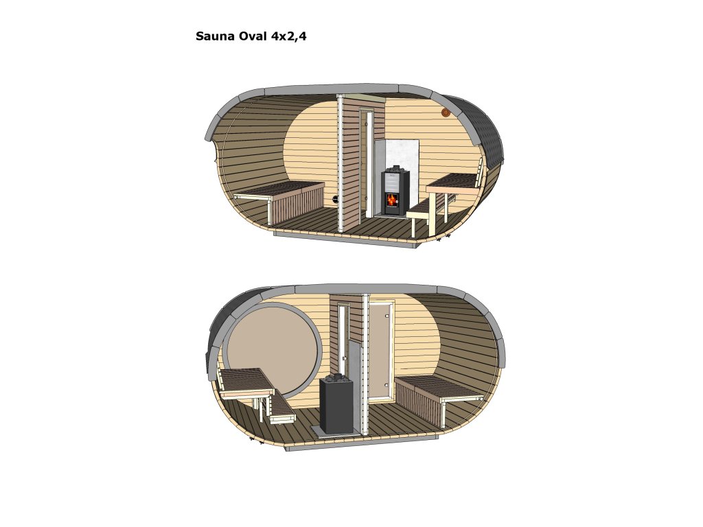 Oválná sauna 4x2,4m, 2 místnosti, thermowood