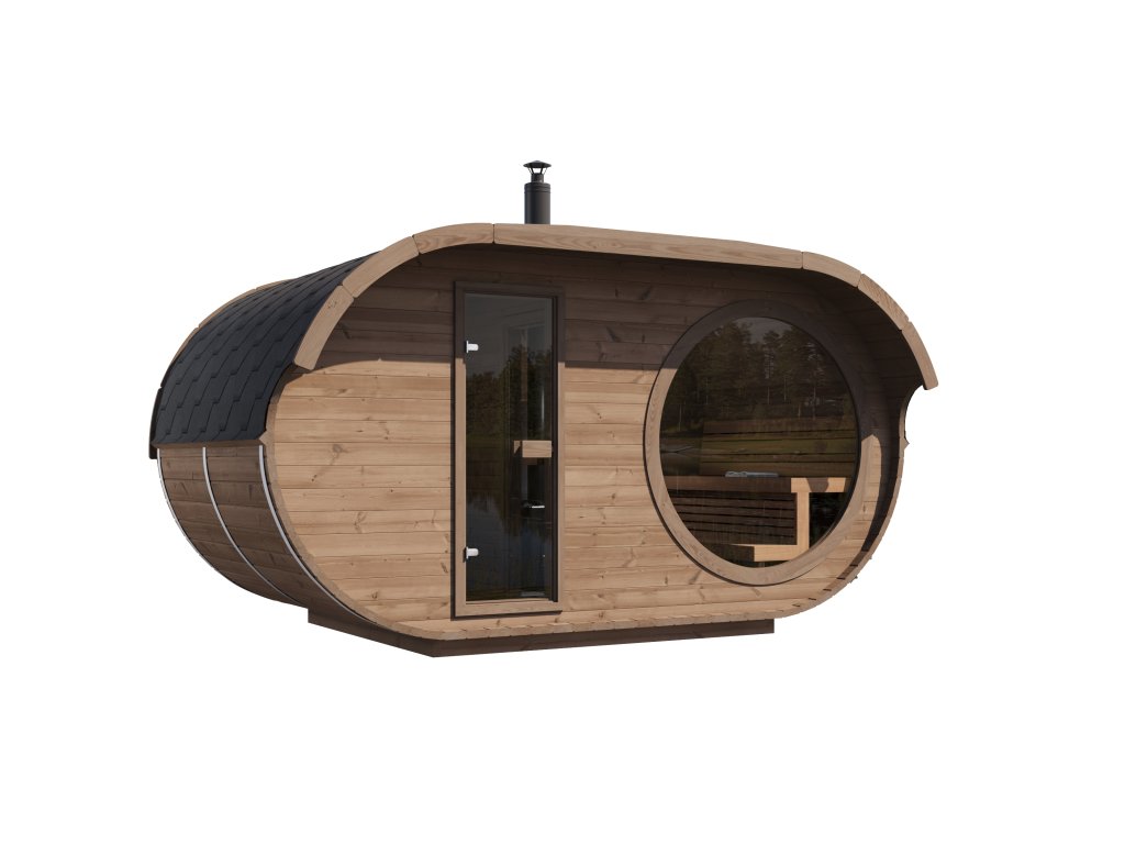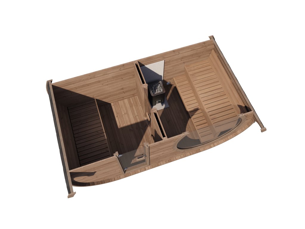 Zakřivený tvar střechy sauny zajišťuje dobré proudění vzduchu v parní místnosti a tím i nejlepší možnou páru. Rovná podlahová plocha sauny poskytuje maximální praktický vnitřní prostor a rozlohu. Dvouúrovňové řešení lavic nabízí možnosti pro saunující s různými preferencemi. Zkušení milovníci sauny si mohou užívat páru na horní úrovni, zatímco lidé s menší výdrží si mohou pohodlně lehnout na lavici níže.