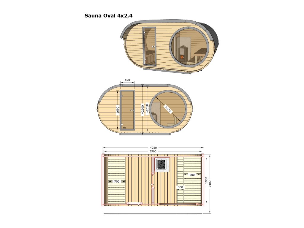 1. Korpus sauny: celková délka 4,05 m, šířka 2,4 m, výška 2,2 m, sauna 1,98x1,9 m
