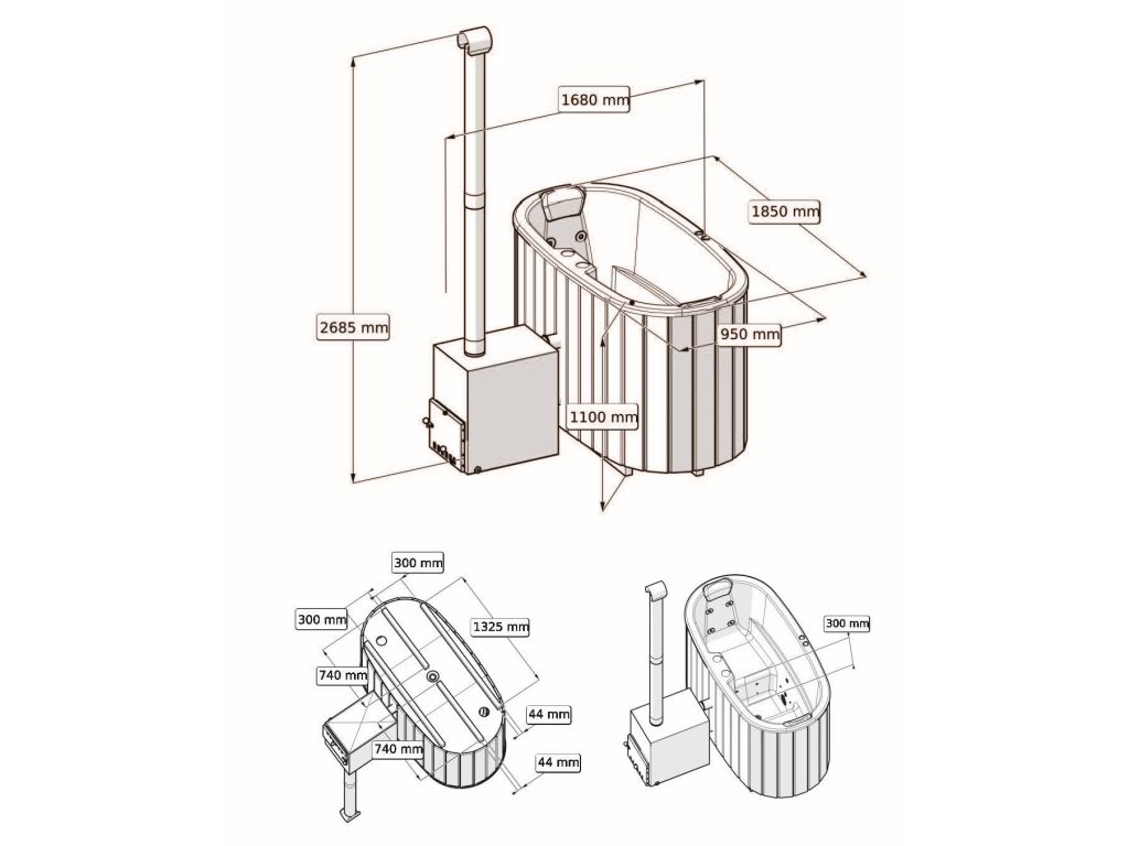 Oválný dřevěný hot tub s externím ohřívačem vody na dřevo o výkonu 35 kW. Vana je vybavena zatepleným krytem pro zachování teploty vody a ochranu proti nečistotám.
