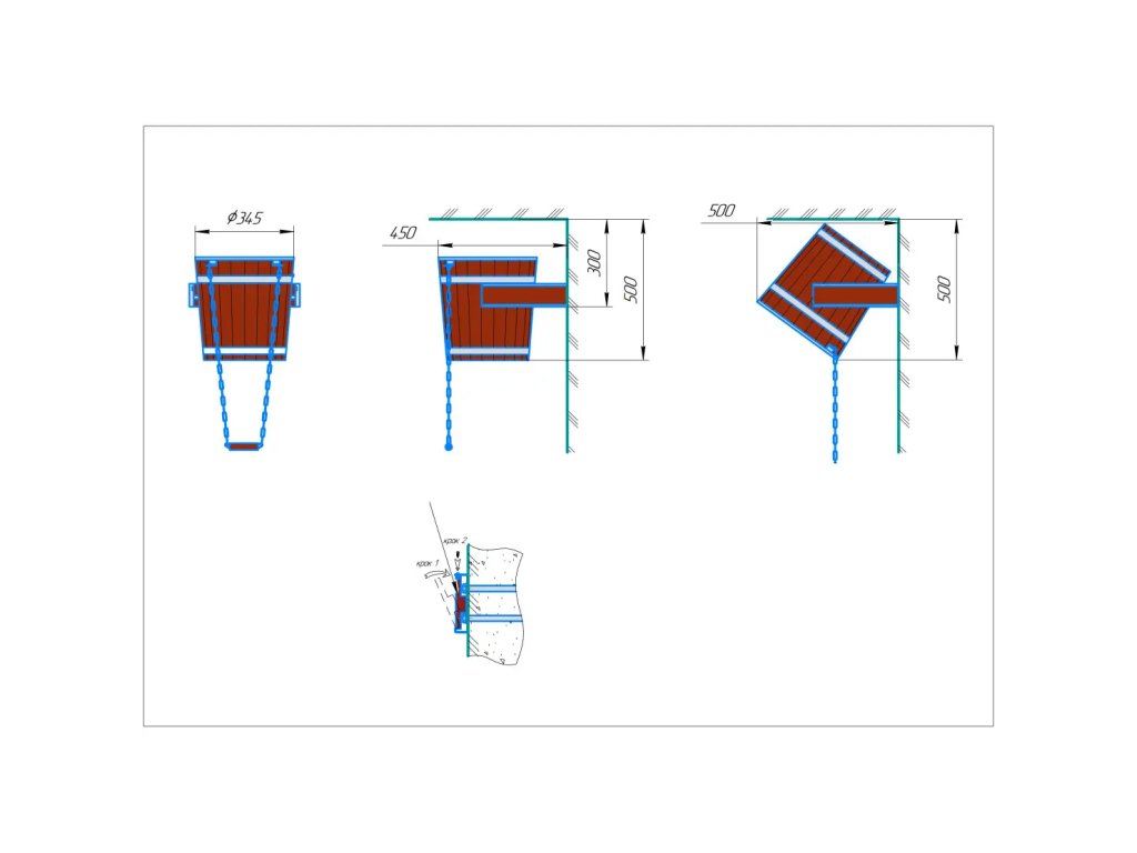 Součástí vědra je systém napouštění, lanové táhlo, uchycovací spony. Upevnění je možné na strop nebo na stěnu.