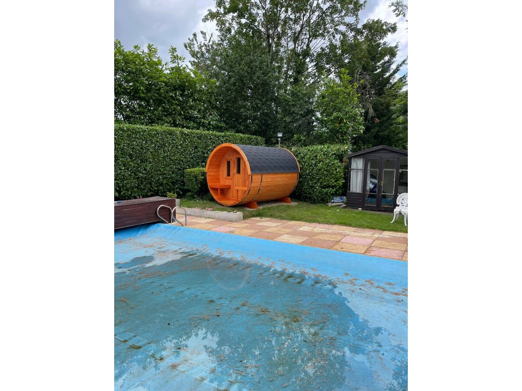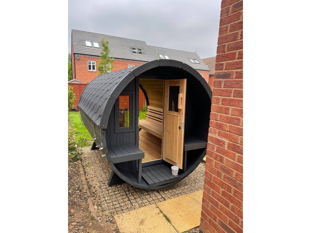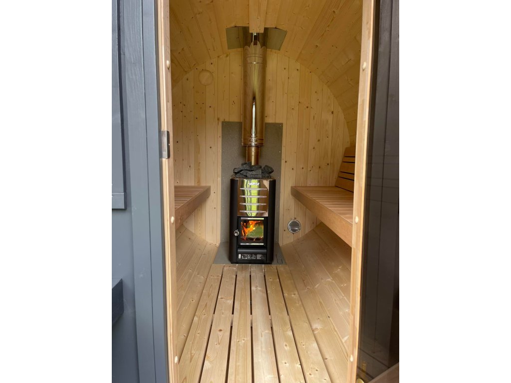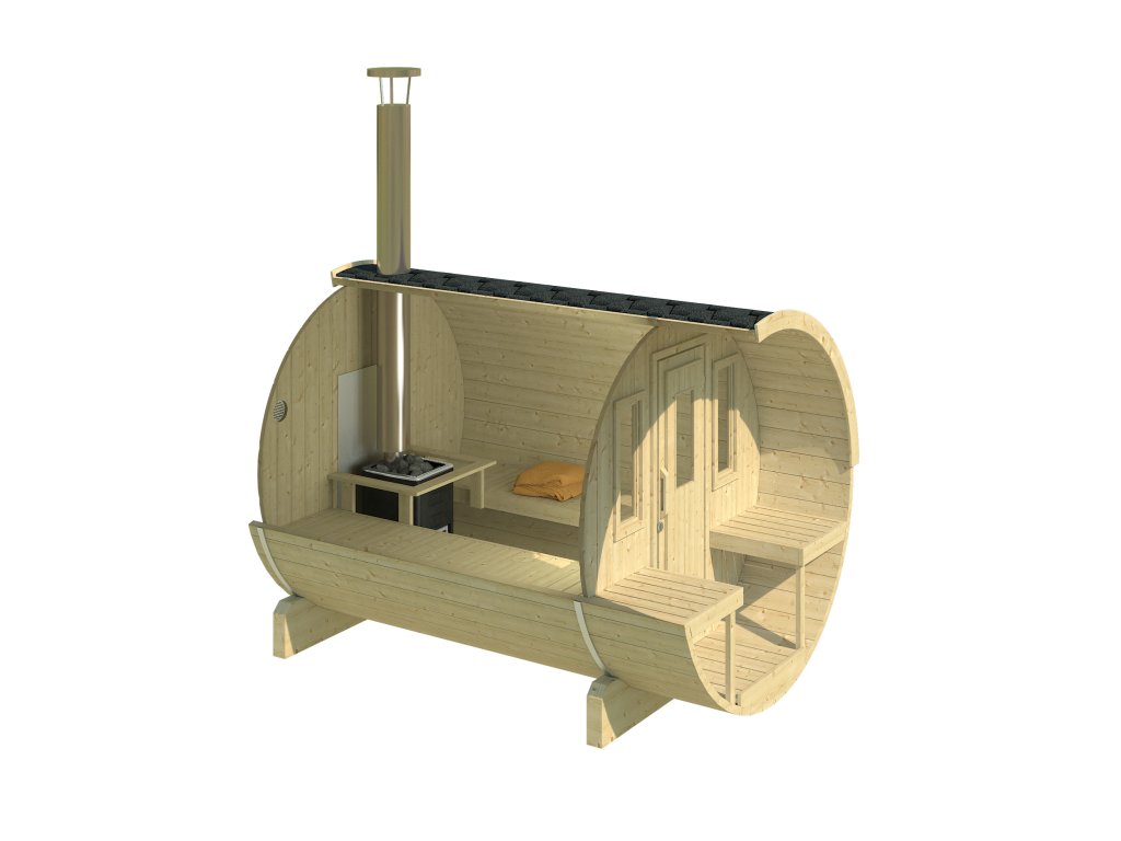 Prostorná jednopokojová sauna s lavicí o délce 210 cm na každé stěně, s místem pro 4-6 osob. Před parní místností je kompaktní terasa s posezením, kde se můžete ochladit nebo počkat na svou řadu. Sudová sauna 280 váží pouze 770 kg, což poskytuje více možností pro transport a užívání si sauny na místě s omezenými možnostmi.