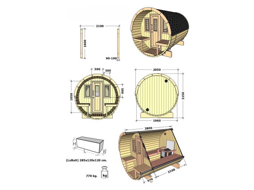 1. Korpus sauny: celková délka 2,8 m, průměr 2,05 m, sauna 2,1 m, terasa 0,57 m