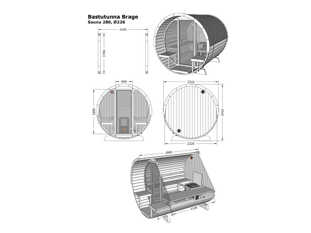 1. Korpus sauny: celková délka 2,8 m, průměr 2,26 m, sauna 2,1 m, terasa 0,555 m