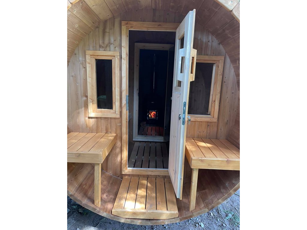 Zaoblený tvar sauny zajišťuje dobrou cirkulaci vzduchu v parní místnosti. Navrženo pro až 6 osob a má samostatnou malou převlékárnu.