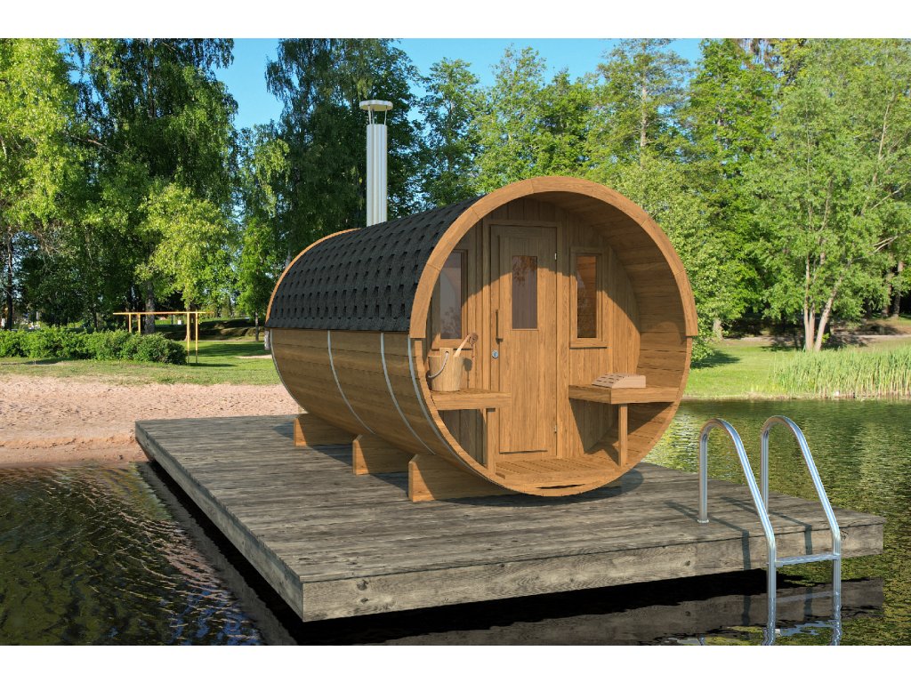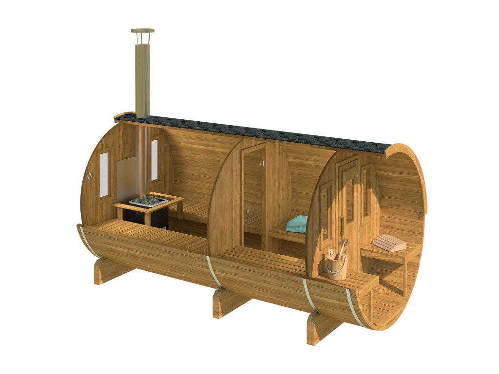 1. Korpus sauny: celková délka 3,3 m, průměr 2,05 m, sauna 1,7 m, terasa 0,57 m