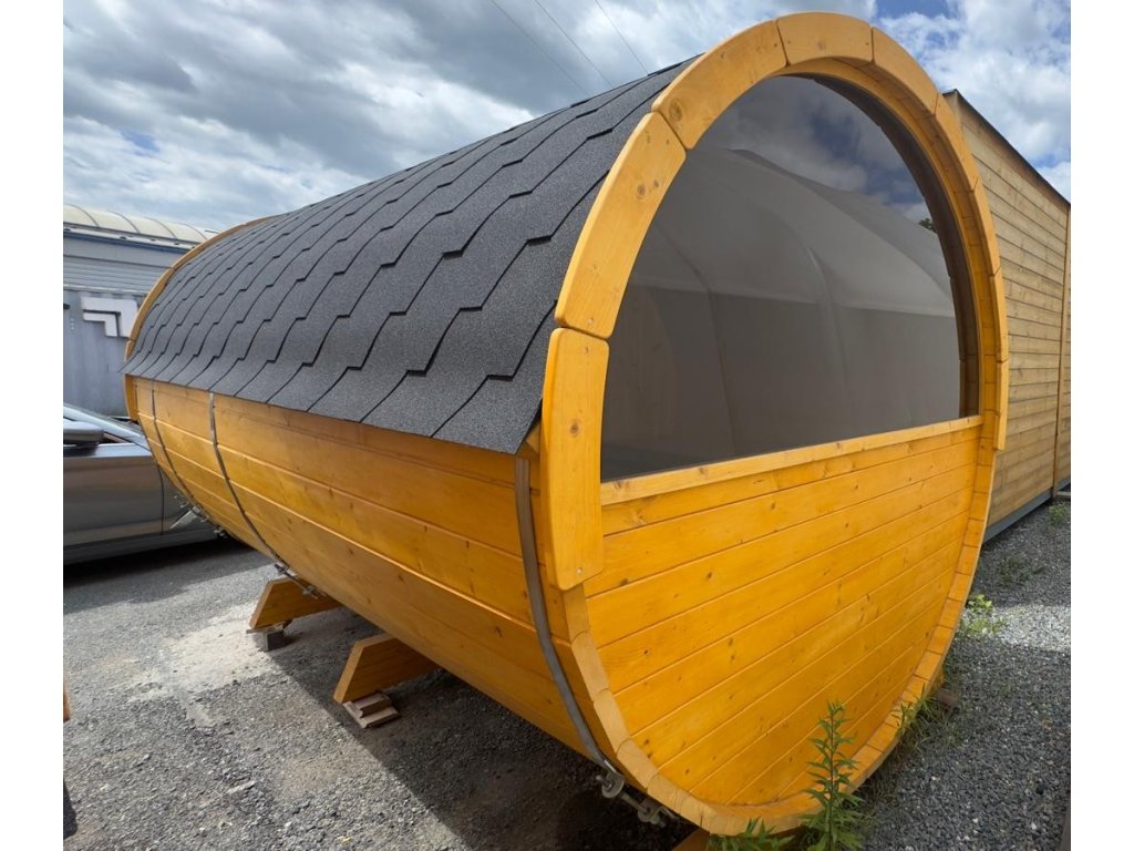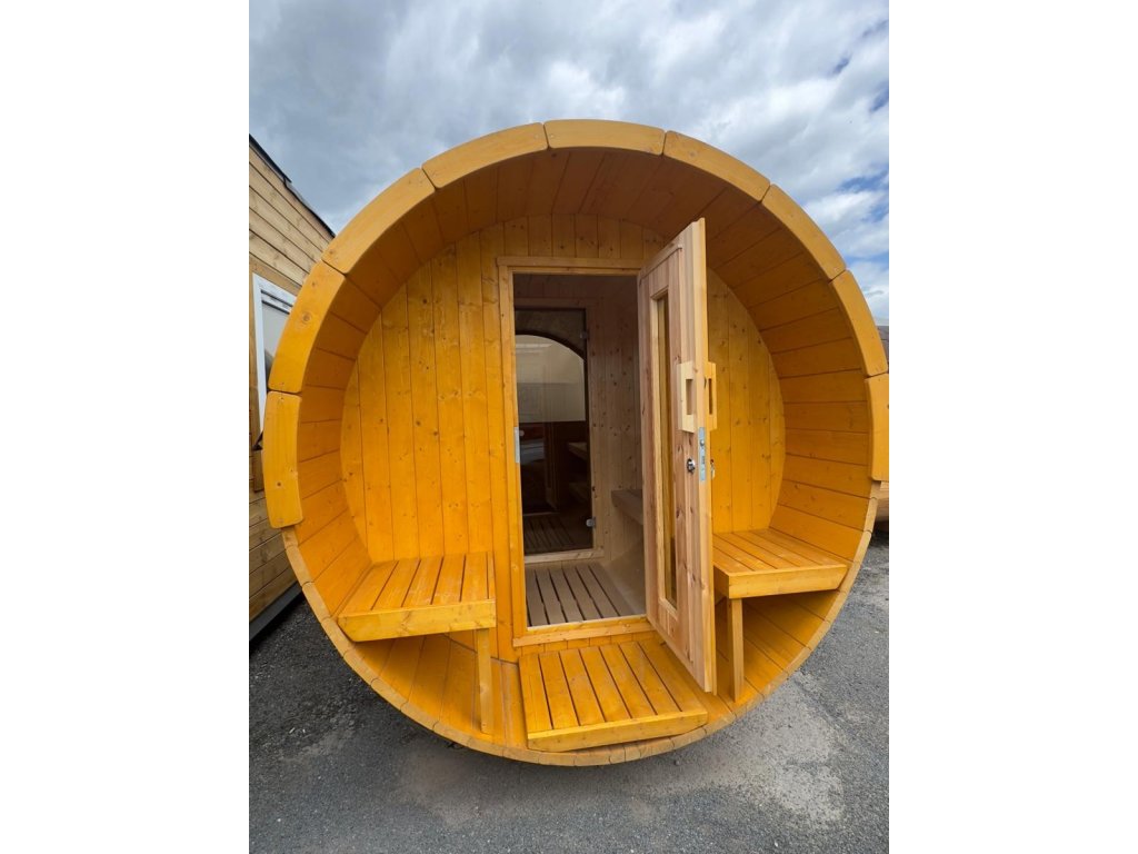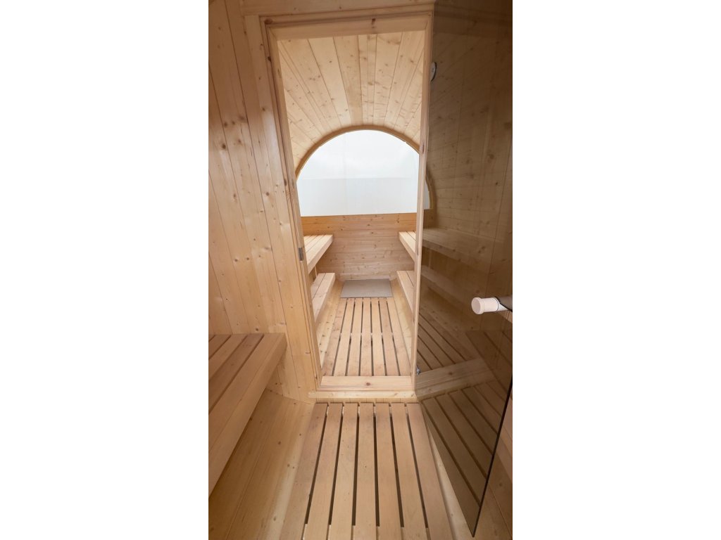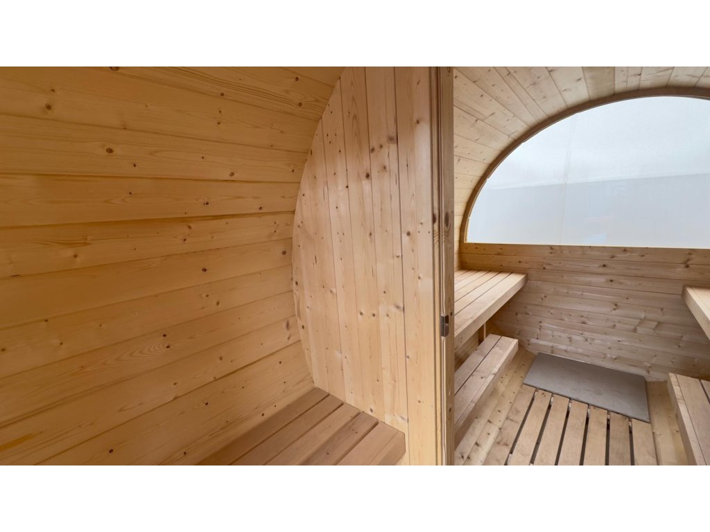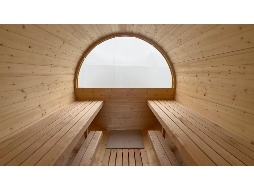1. Korpus sauny: celková délka 4 m, průměr 2,25 m, parní místnost 2,1 m, místnost před vchodem do sauny 1,17 m, teráska.