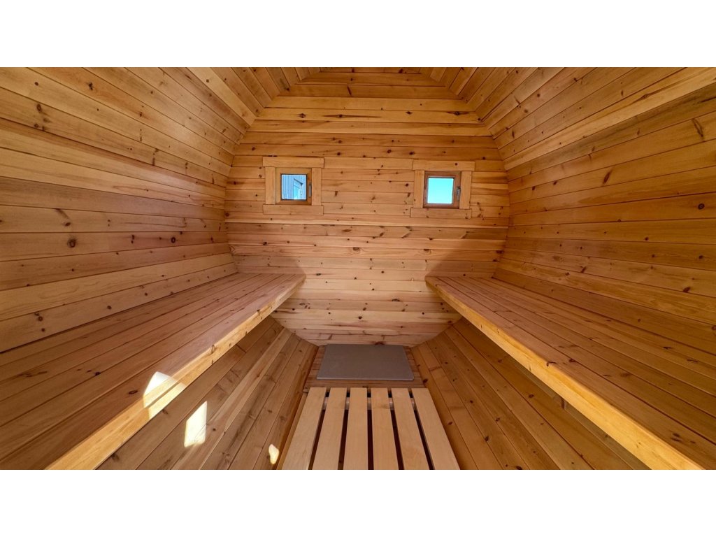 Užijte si dokonalý odpočinek v této jedinečné cedrové sauně, která spojuje přírodní design a funkčnost.