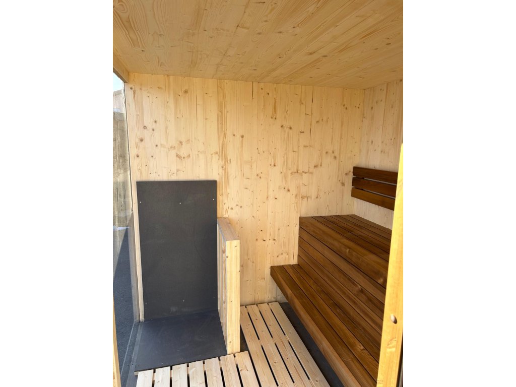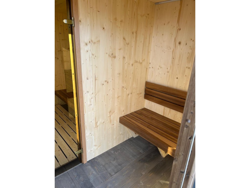 Součástí řešení je menší předsíňka ze stejného materiálu, která poskytuje útulný prostor pro převlékání, bezpečné odložení věcí a pohodlnou přípravu na saunování. V sauně se snoubí česká kvalita zpracování s moderním skandinávským designem – to vše v praktickém modulárním provedení umožňujícím rychlou a efektivní instalaci.
