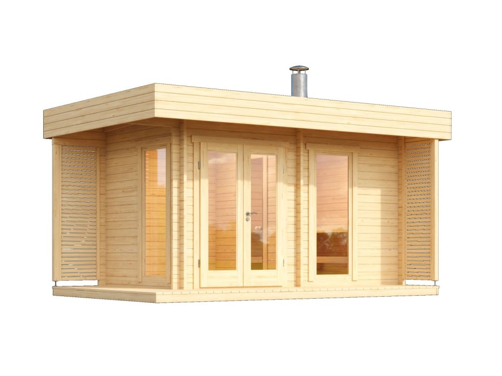 Saunový domek ze severského smrku má vnější rozměry 3,723 x 2,082 m a dvě místnosti. Na dvou stranách je přesah střechy dalších 80 cm, také zde si můžete vytvořit malou odpočívárnu. Síla stěny 40 mm. Určeno pro až 4 osoby.
