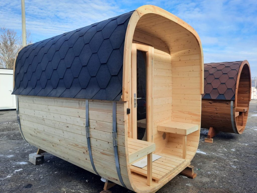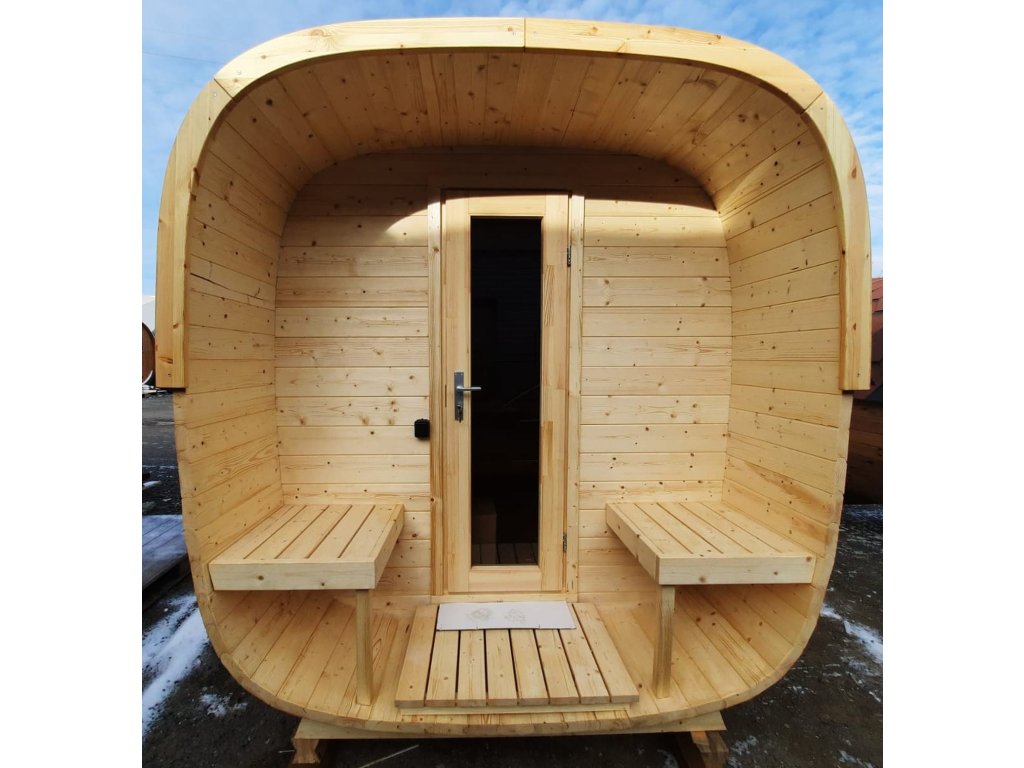 Exkluzivní venkovní sauna prémiové třídy pro 2-5 osob vyrobená ze smrku, klíčová je zde cenová dostupnost. Má útulnou terásku pro dva.