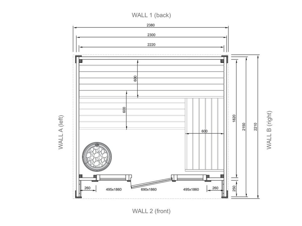 1. Vnější rozměry: hloubka 2,21 m, šířka 2,38 m, výška 2,4 m; sauna vnitřní rozměry šířka 2,22 x hloubka 1,82 m