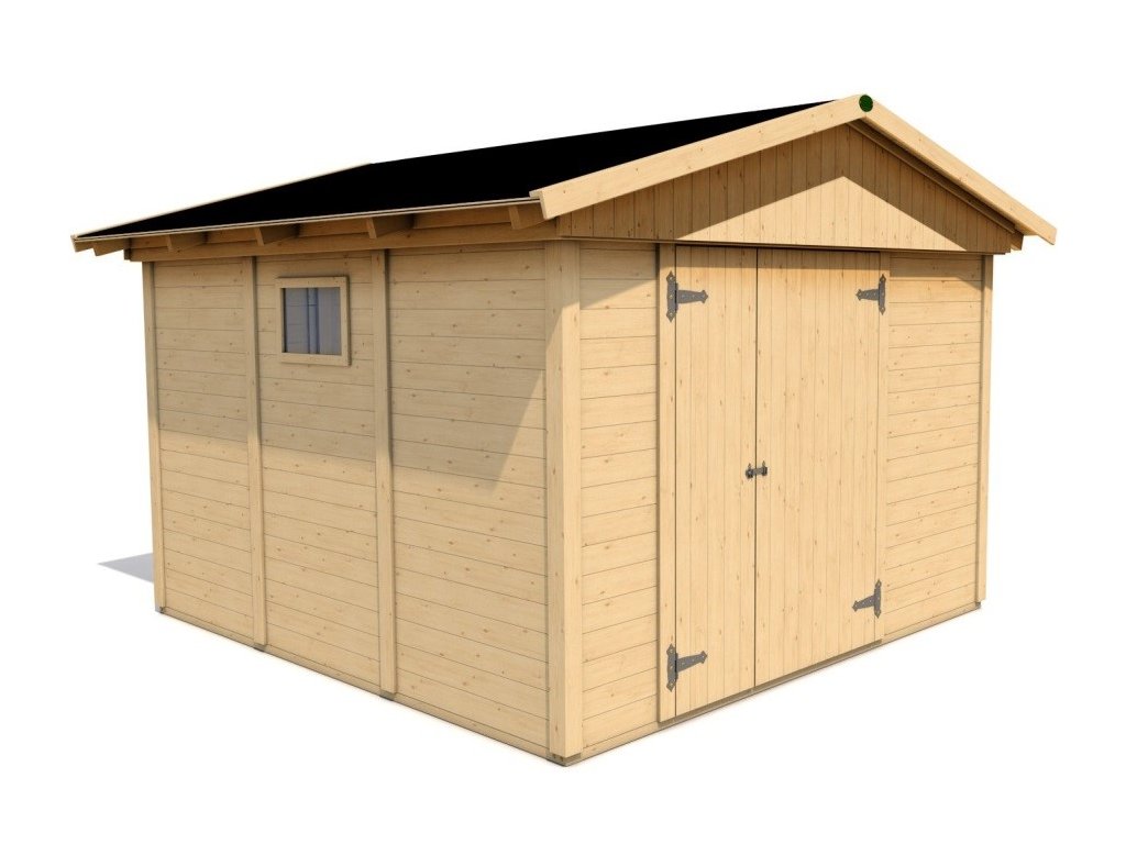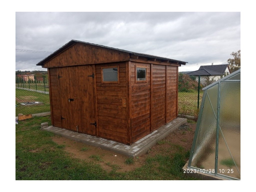 Zahradní domek má přírodní barvu bez jakékoliv povrchové úpravy a je připraven k dalším nátěrům a impregnacím.