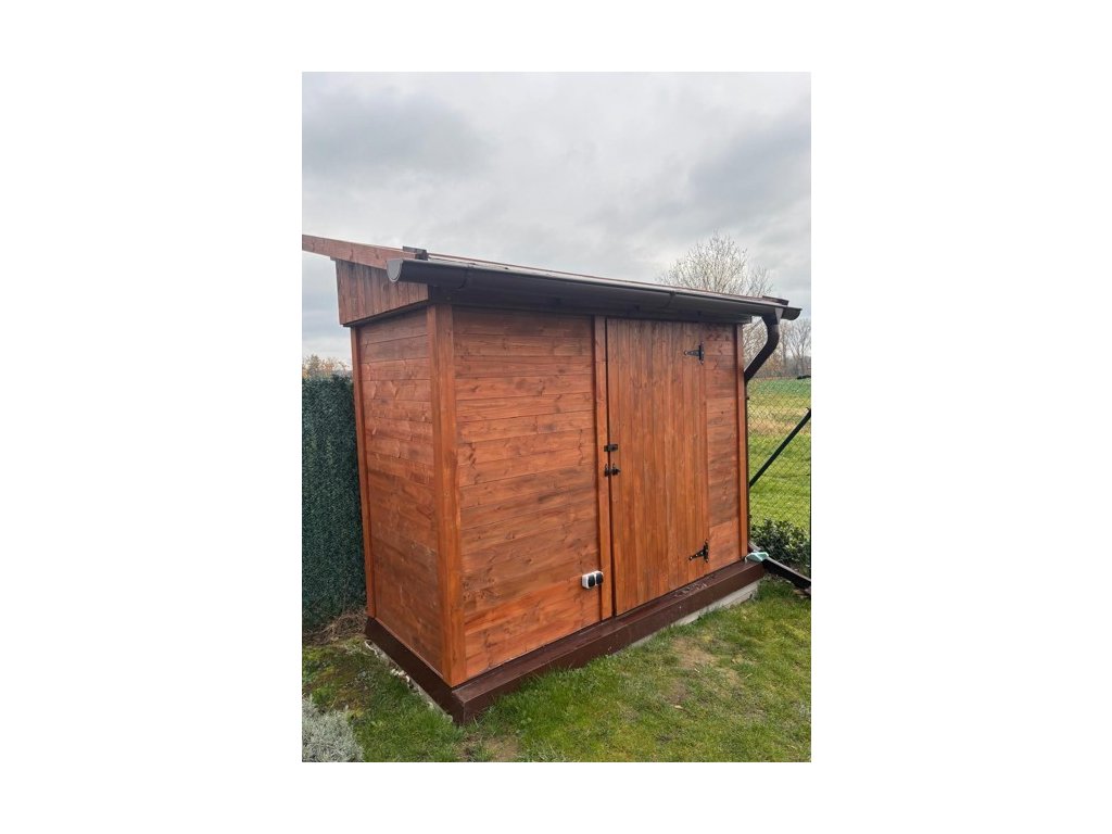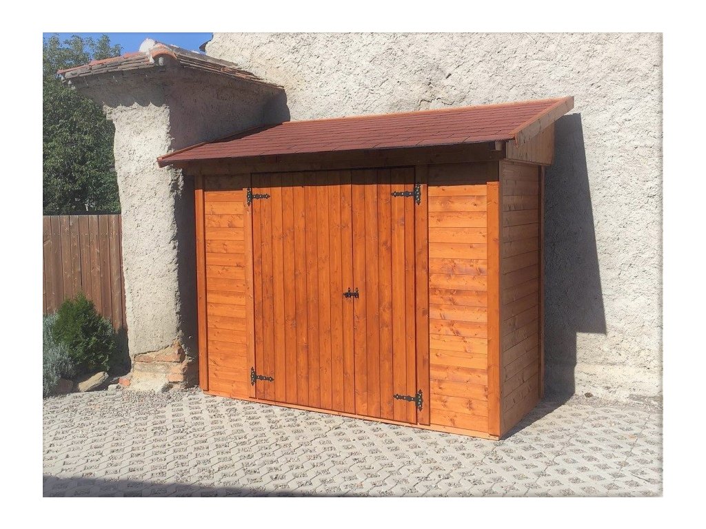 Zahradní domek má přírodní barvu bez jakékoliv povrchové úpravy a je připraven k dalším nátěrům a impregnacím.