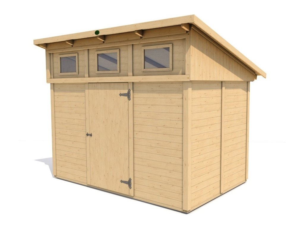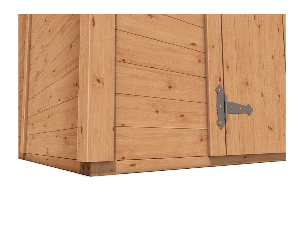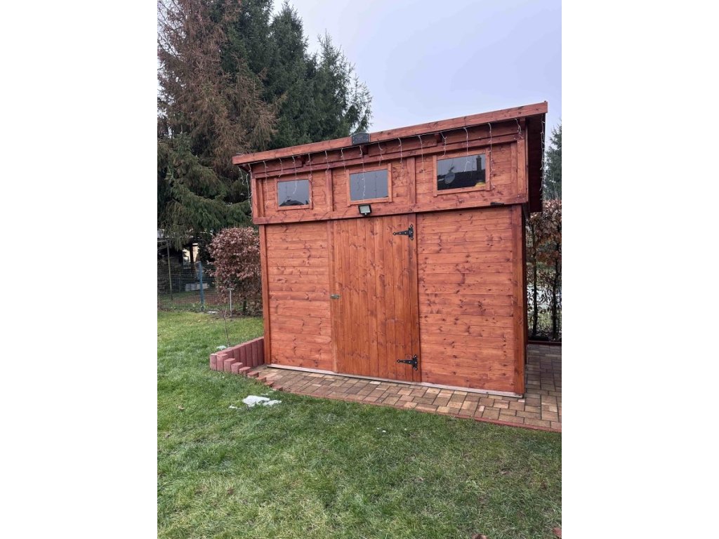 Zahradní domek má přírodní barvu bez jakékoliv povrchové úpravy a je připraven k dalším nátěrům a impregnacím.