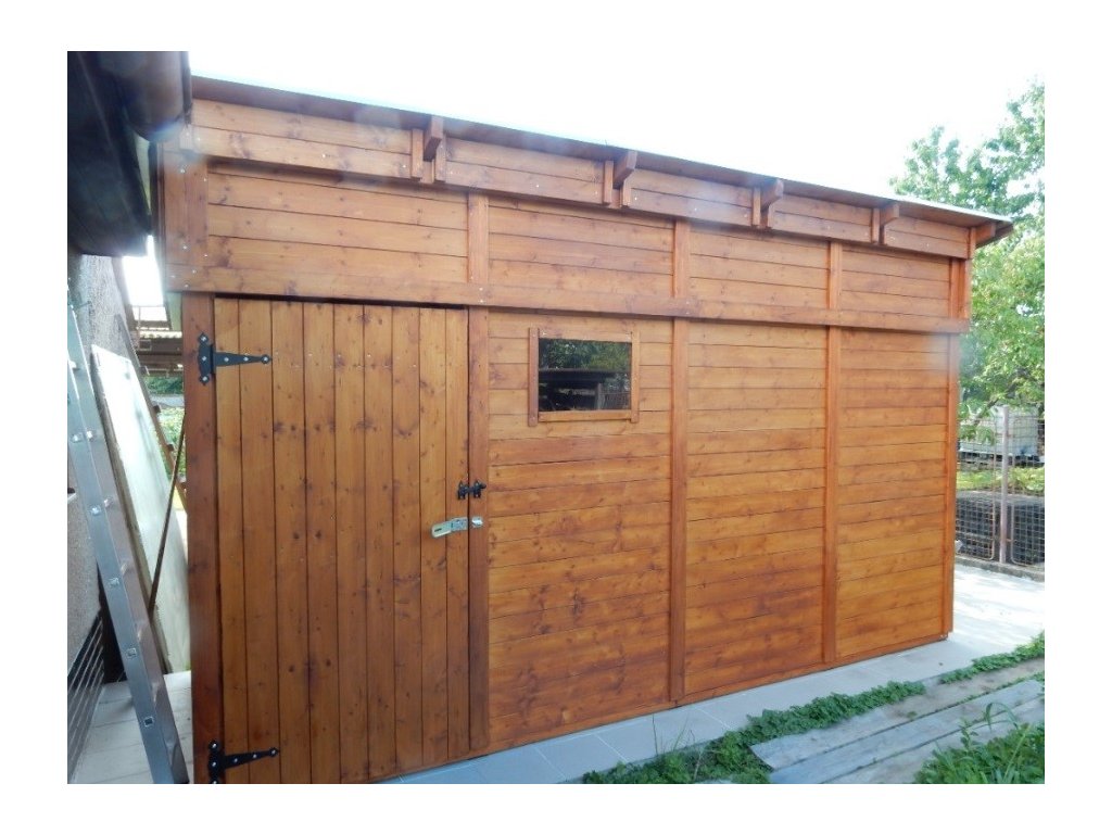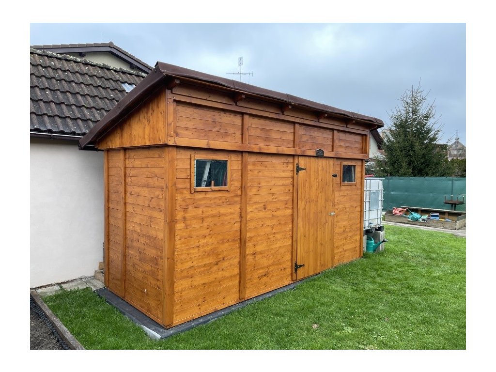 Zahradní domek má přírodní barvu bez jakékoliv povrchové úpravy a je připraven k dalším nátěrům a impregnacím.